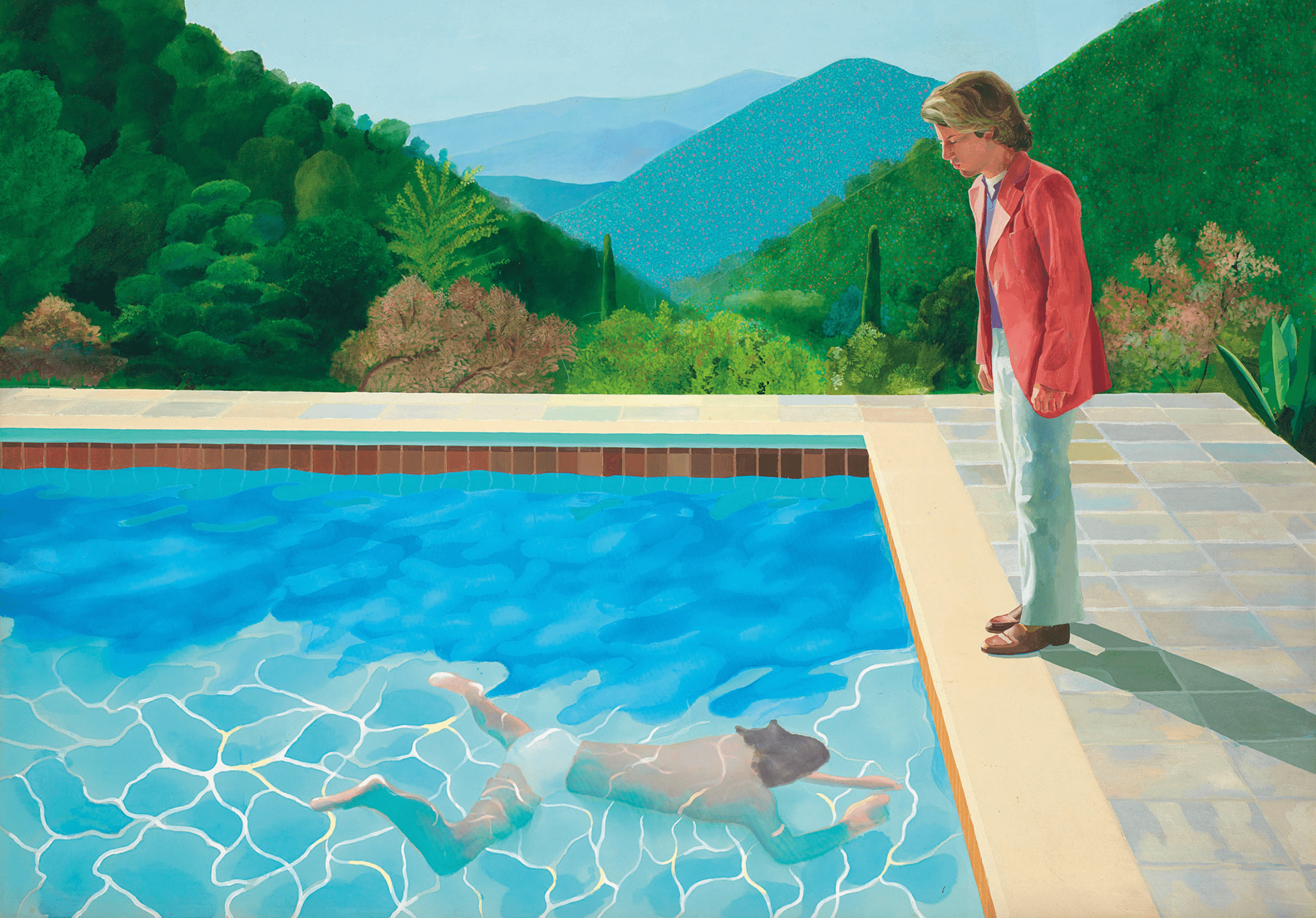 Suele decirse que el británico David Hockney es uno de los artistas más influyentes y originales del arte contemporáneo de la segunda mitad del siglo XX, en parte por haber convertido lo cotidiano en una investigación profunda sobre la mirada. Pero también porque eligió un camino propio cuando la vanguardia desconfiaba de la pintura figurativa, una apuesta que entonces parecía anacrónica. Tras radicarse en Los Ángeles en 1964, encontró en las piscinas un laboratorio ideal: un motivo moderno, luminoso y técnicamente implacable para desplegar su obsesión con la luz. Hockney llamó la atención por su forma de vestir, su libertad para moverse entre formatos (fotografía, grabado, ópera, iPad) y por su vida pública: no pidió permiso para vivir —entre otras cosas— su homosexualidad sin dramatismos en tiempos de juicio lapidario. Esto, sumado a lo novedoso de su trabajo, terminó por consolidar su imagen de artista excéntrico, original y único. La obra Portrait of an Artist (Pool with Two Figures) fue pintada en 1972 y reúne dos obsesiones suyas: el doble retrato y el agua. La composición nació del cruce fortuito de dos fotografías que vio juntas en el suelo del estudio: un nadador bajo la superficie y un hombre de pie mirando hacia abajo, que en el lienzo corresponde a Peter Schlesinger, su ex pareja. Tras meses de pruebas y correcciones, rehízo el gran lienzo desde cero y lo terminó la noche anterior a enviarlo a su exposición en Nueva York. Su escala monumental, la dificultad técnica —la refracción del cuerpo sumergido, la vibración del agua— y, sobre todo, la intimidad narrada sin énfasis suelen impresionar tanto al público como a la crítica. Vendida en más de 90 millones de dólares, Portrait of an Artist se transformó en un récord de subasta para un artista vivo.
